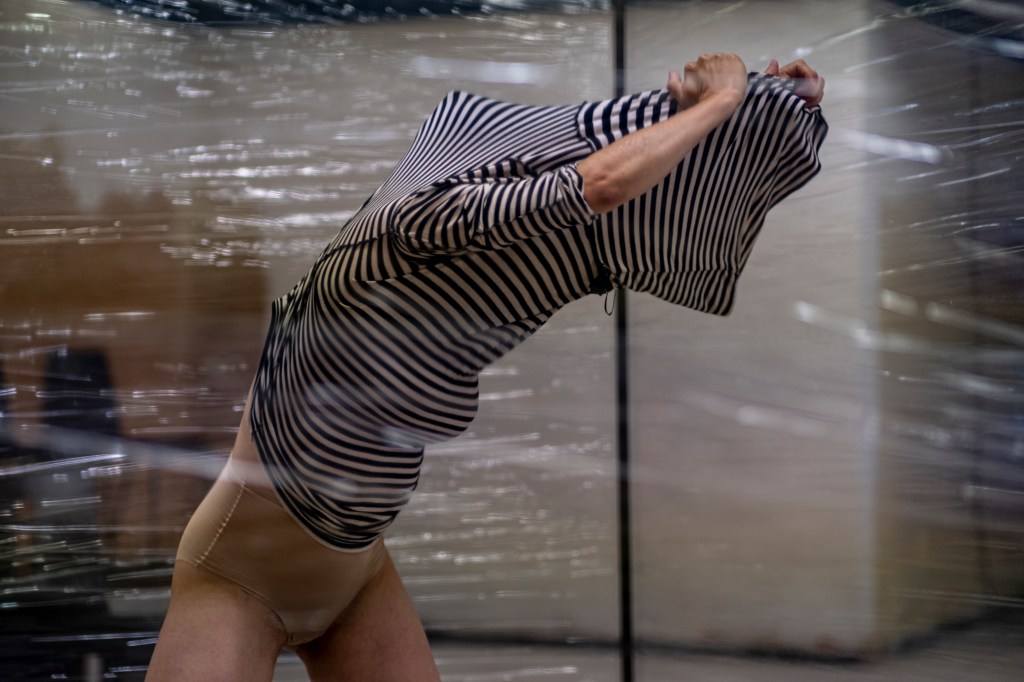 In the Long Durational Performance … at 40 degrees I first thaw! a body tries to embrace itself. A body that explores which sweater warms it lovingly and which takes the air it needs to breathe. Getting dressed and undressed over and over again. Applying one protective layer after the other. weaving in. In as many sweaters as possible. Transforming into another being.