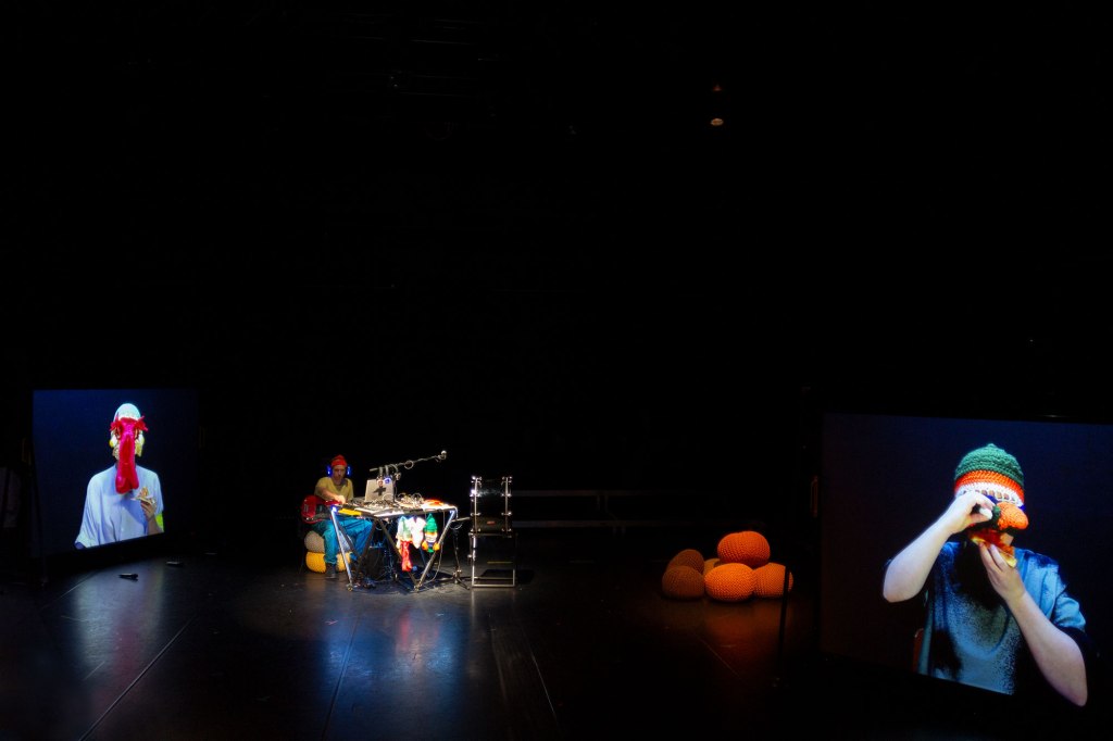 Experiencing a hybrid of installation and performance, the audience listens to protest stories via wireless headphones, watches media reporting taking a life of its own on screens and follows the three live performers as they get ready for the uprising. Sit-ins are transformed into choreographic elements, urgent reminders into synth pop songs, balaclavas into knitted breasts and soft cushions into barricades.